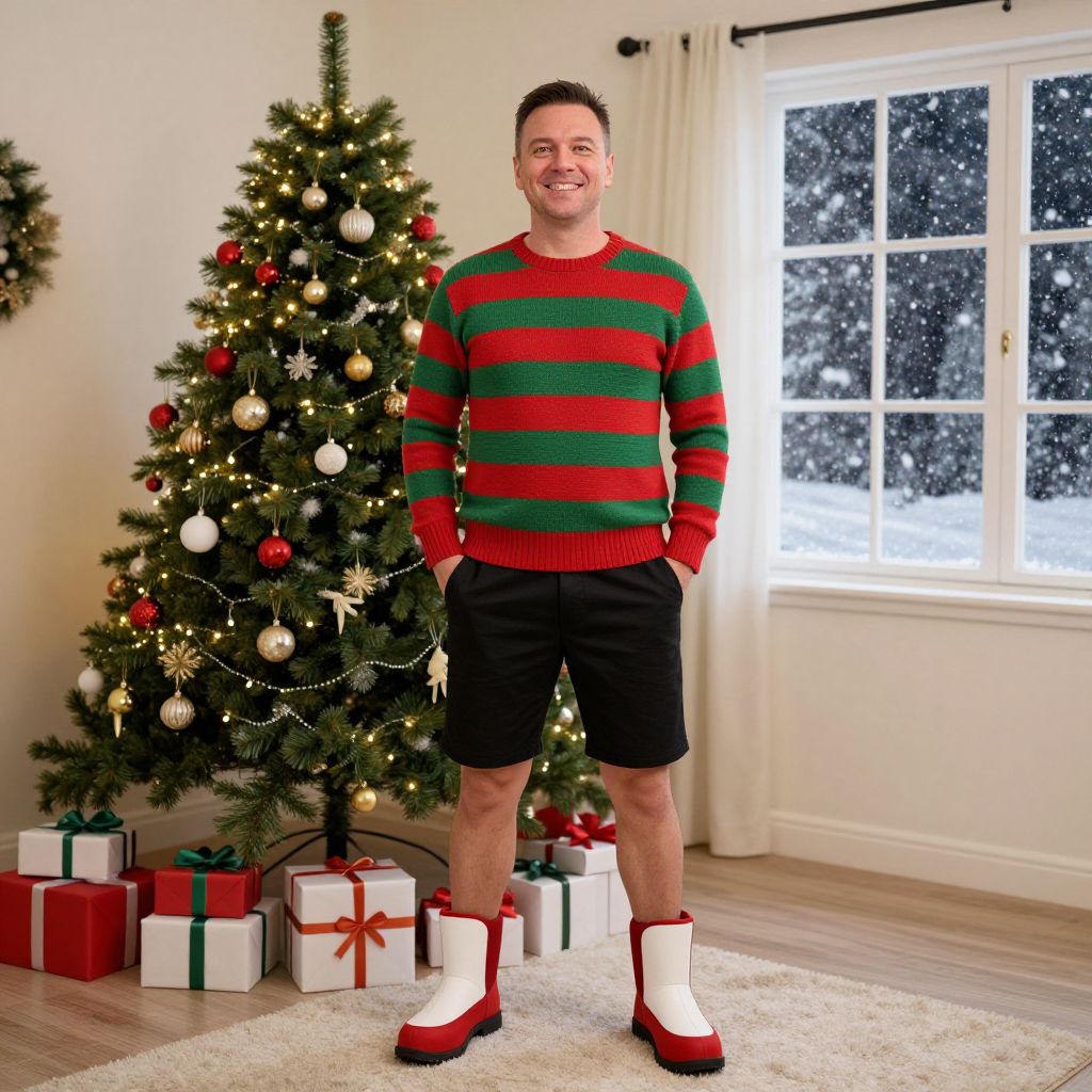A man in his late 30s with a warm, friendly smile, wearing a crisp white shirt, green pants, and a red and white Santa hat, stands confidently in front of a beautifully decorated Christmas tree. The tree is adorned with glowing lights, twinkling ornaments, and a red bow at the top. Soft winter light filters through the window behind him, casting a golden hue over the scene. The background features a cozy, rustic Christmas home with snow-covered rooftops and a frosty atmosphere, capturing the festive and joyful spirit of the holiday season.