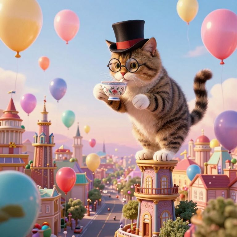 A whimsical digital illustration features a large, adorable tabby cat with brown and black stripes, wearing a tiny black top hat and round glasses, perched on a tall, ornate tower. The cat holds a delicate, floral-patterned teacup in its front paws. The background is a colorful, fairy-tale cityscape with pastel buildings, floating balloons in various colors, and a bright blue sky with soft pink and orange hues. The scene is lively and magical, with tiny people and cars visible in the streets below. The cat's expression is focused and gentle, adding to the enchanting, dreamlike atmosphere.