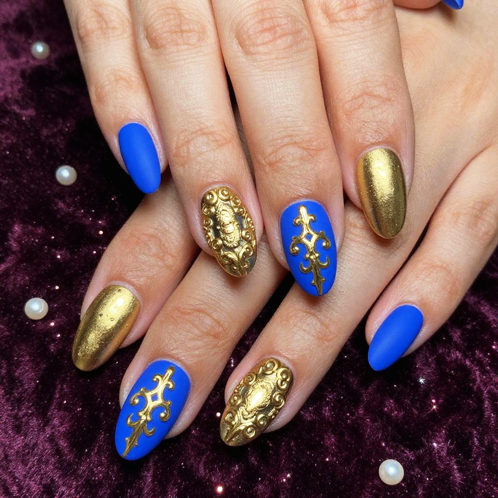 Close-up of gold and royal blue nails with ornate baroque-inspired designs, matte and metallic textures combined, set against a rich velvet background, featuring subtle glitter and pearl embellishments, high resolution fashion photography
