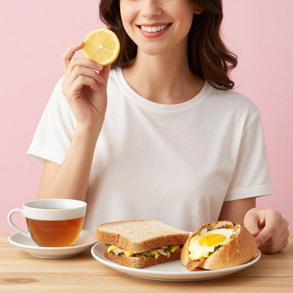 Smiling woman holding a lemon slice while enjoying a breakfast spread featuring a cup of tea, a sandwich, and a savory bread roll with visible egg yolk filling, all arranged on a wooden table against a soft pink backdrop.