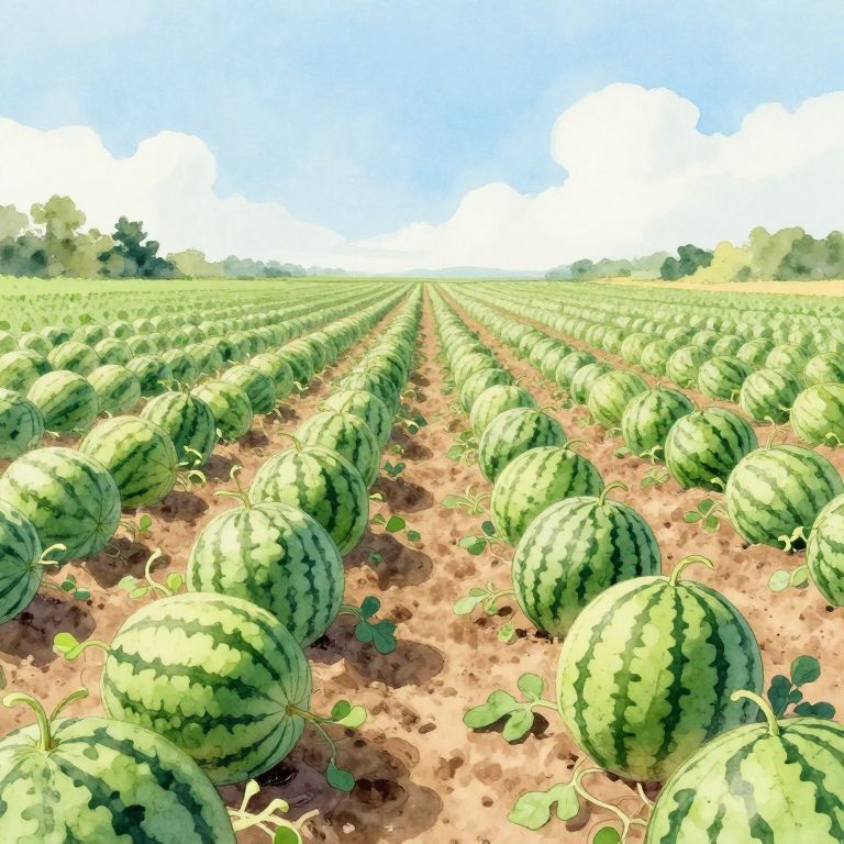 Watercolor-style digital drawing of a vast, sunlit watermelon field with rows of green-striped watermelons under a bright blue sky.