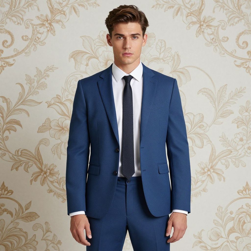 Photograph of a young white man with short, dark brown hair and a serious expression, standing against a cream-colored, floral-patterned wallpaper. He is wearing a tailored, dark blue suit with a white dress shirt and a black tie. The suit fits well, emphasizing his slim, athletic build. The wallpaper features elegant, light beige floral designs that add a touch of sophistication to the background. The lighting is even, highlighting the subject's features and the texture of the suit. The overall composition is formal and professional.