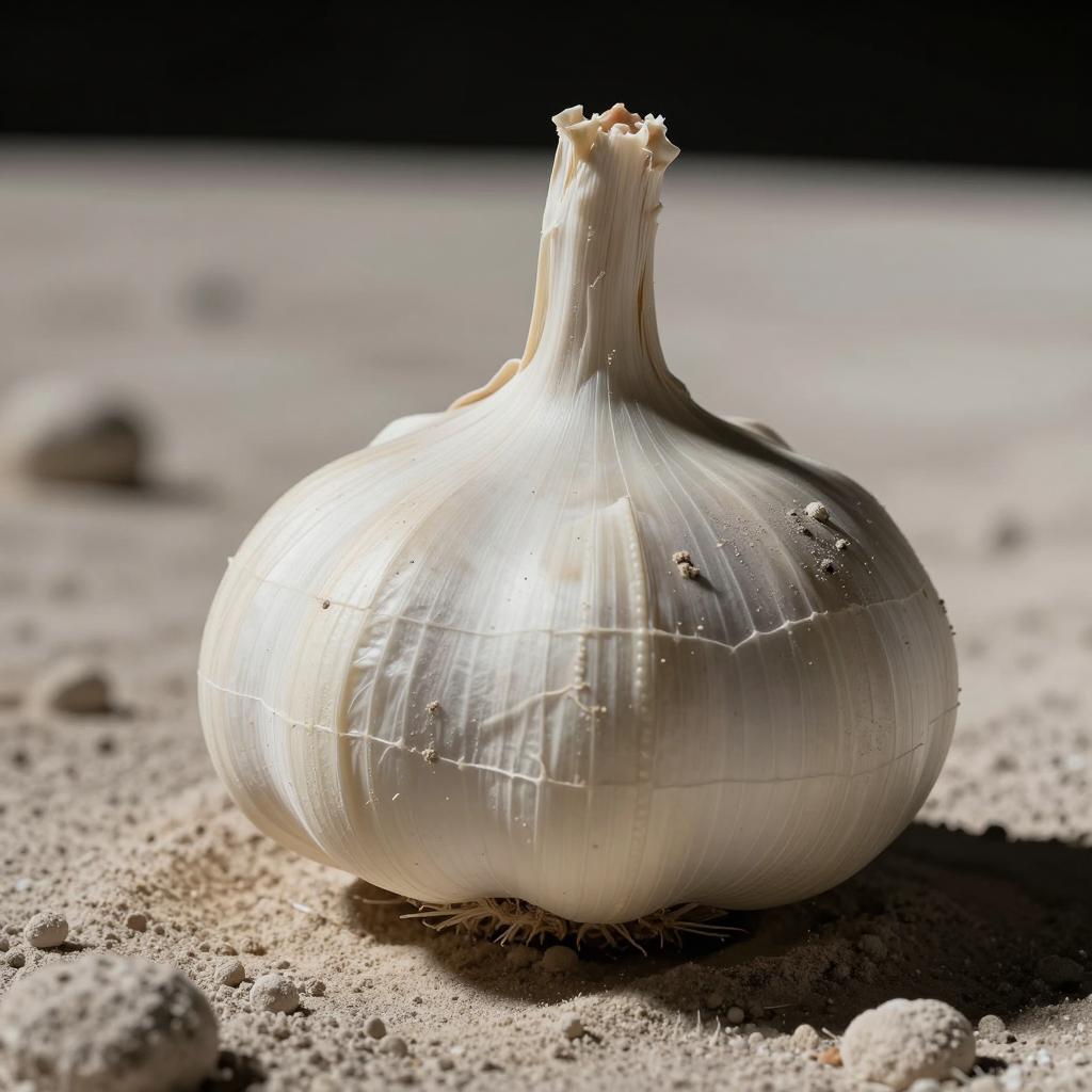 Close-up digital photo of a nomadic moon turtle resembling a garlic bulb, resting on cream-white lunar regolith plains. The creature features skin textures akin to wrinkled translucent membranes with a quilted dust coat. Captured in ultra HD with dramatic lighting and shallow depth of field, presenting a realistic outer space wildlife portrait in professional wildlife photography style.