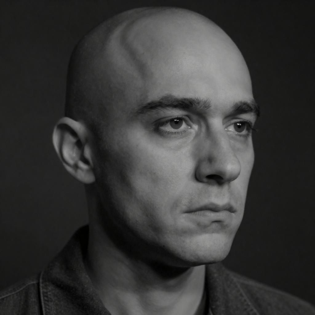 Dark shot, photo of 41 y.o man, skin moles, short hair, looks at viewer, cinematic shot, hard shadows