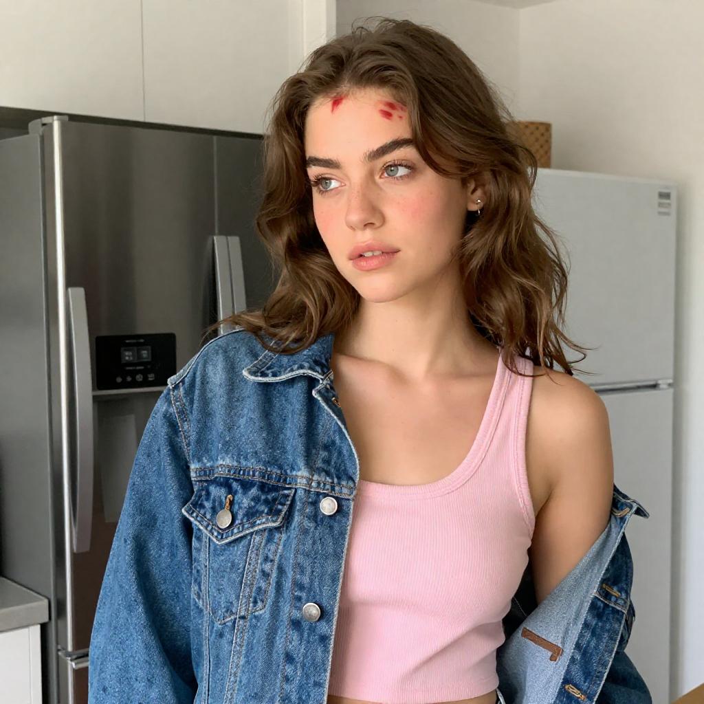Photograph of a young woman with light brown wavy hair, wearing a pink tank top and a blue denim jacket, standing in a kitchen. She has a red mark on her forehead and is looking to the side. Black refrigerator and white fridge in the background. Casual indoor setting.