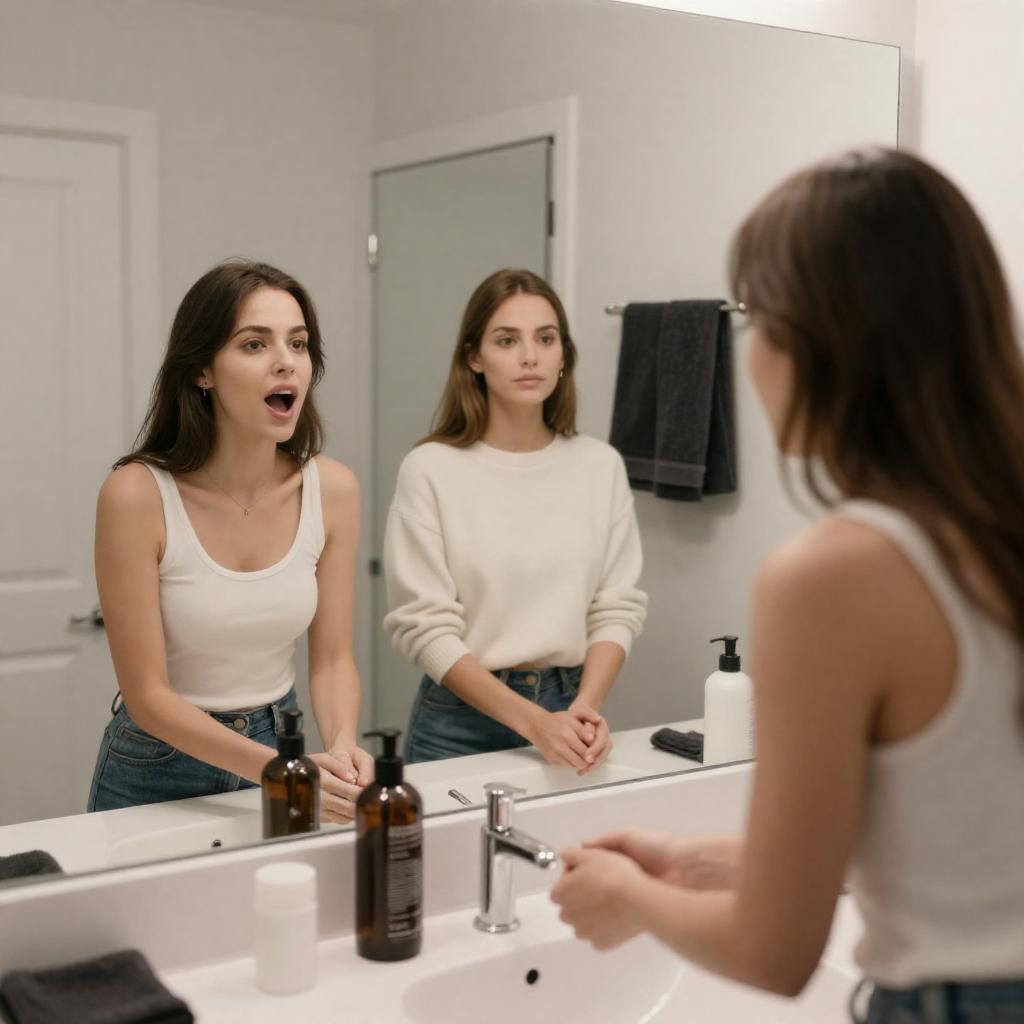 Photograph of a woman with short dark hair, wearing a white tank top and blue high-waisted pants, standing in a doorway. She looks intently into a mirror, her right hand on her chest. Background includes a window with light filtering through curtains, a shelf with plants, and a wall with photos. Her reflection shows a focused expression. The image has a shallow depth of field, with the foreground blurred. Two people, one in the reflection.