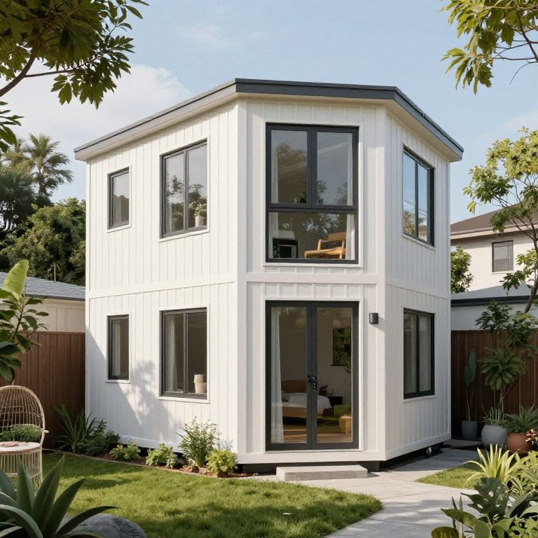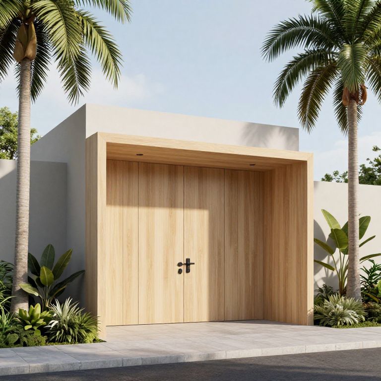 Simplicity An entrance elevation design light wood and neutral materials, add landscape palm trees and tropical plants, very realistic render style,