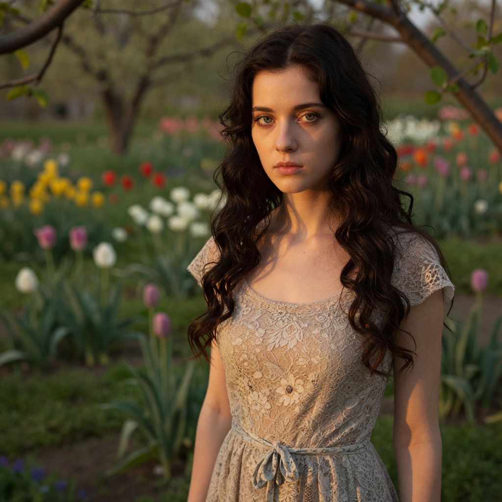 A captivating portrait of an enigmatic young Western European woman with hazy green eyes and long, wavy dark hair framing her face. She dons a delicate vintage lace dress adorned with intricate floral patterns, cinched at the waist to emphasize her slender figure. The background showcases a softly blurred expansive garden filled with vibrant spring blooms and lush foliage in various stages of growth, creating an ethereal atmosphere. Gentle yet dramatic lighting warms her face and dress with golden highlights while casting an emotional gradient that exudes serenity and a hint of mystery. Her thoughtful gaze extends into the distance from a unique perspective, as if through gently swaying tree branches, inviting viewers to explore her captivating enigma.