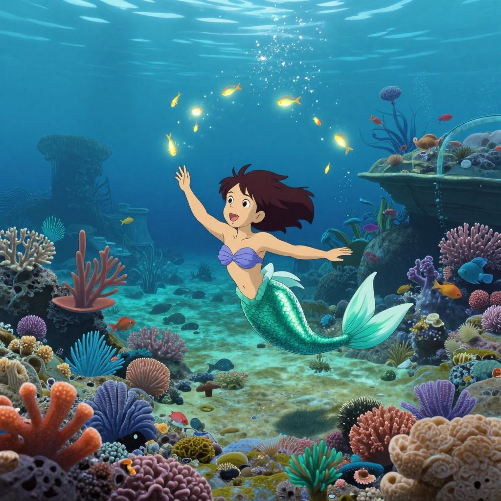 Envision an alluring underwater realm reminiscent of Studio Ghibli's captivating visuals, showcasing a curious young mermaid adorned with shimmering scales in hues of turquoise and emerald as she elegantly dances amidst vibrant coral gardens teeming with exotic marine life. From a distinctive aerial viewpoint above the surface, witness her delightful expression as she engages playfully with a group of tiny, glowing fish that swirl around her, creating an enchanting light spectacle. The atmosphere is both tranquil and exhilarating, evoking a sense of awe and exploration, while the lush colors and intricate details emphasize the magical allure of this aquatic paradise.