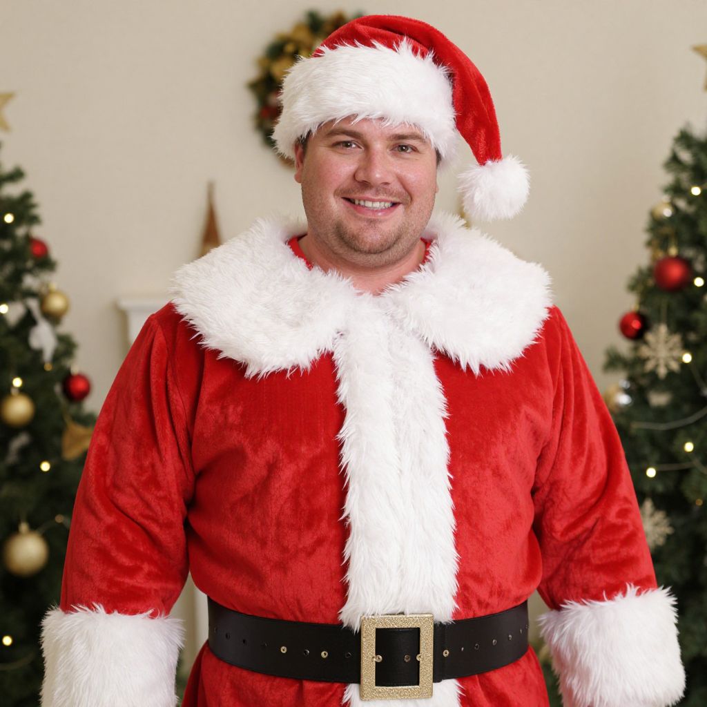 Photograph of a smiling, middle-aged man in a red Santa Claus outfit with white fur trim, black belt, and Christmas trees in the background.