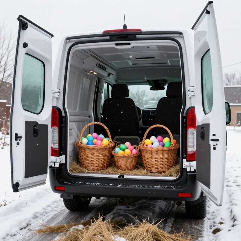 Opaque a photography of the back of a brand new white pro master cargo van with open doors, inside wicker brown baskets full of colorfull easter eggs sitted on dried grass, its winter and snowing,