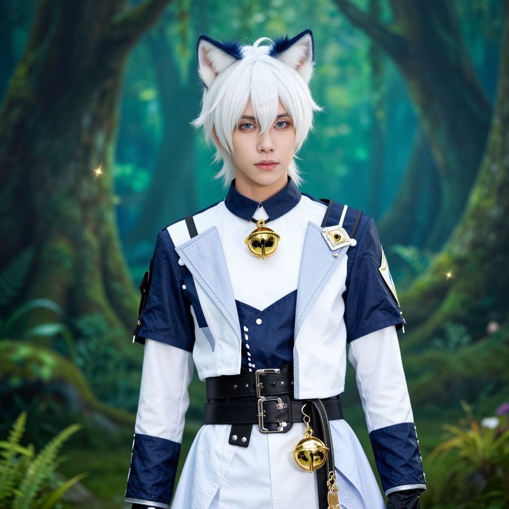 Felix Argyle cosplay featuring detailed blue and white healer's attire with cat ears and tail, standing in a lush enchanted forest, soft sunlight filtering through leaves, expressive eyes and playful pose, sharp anime details, vivid colors, and fantasy atmosphere.