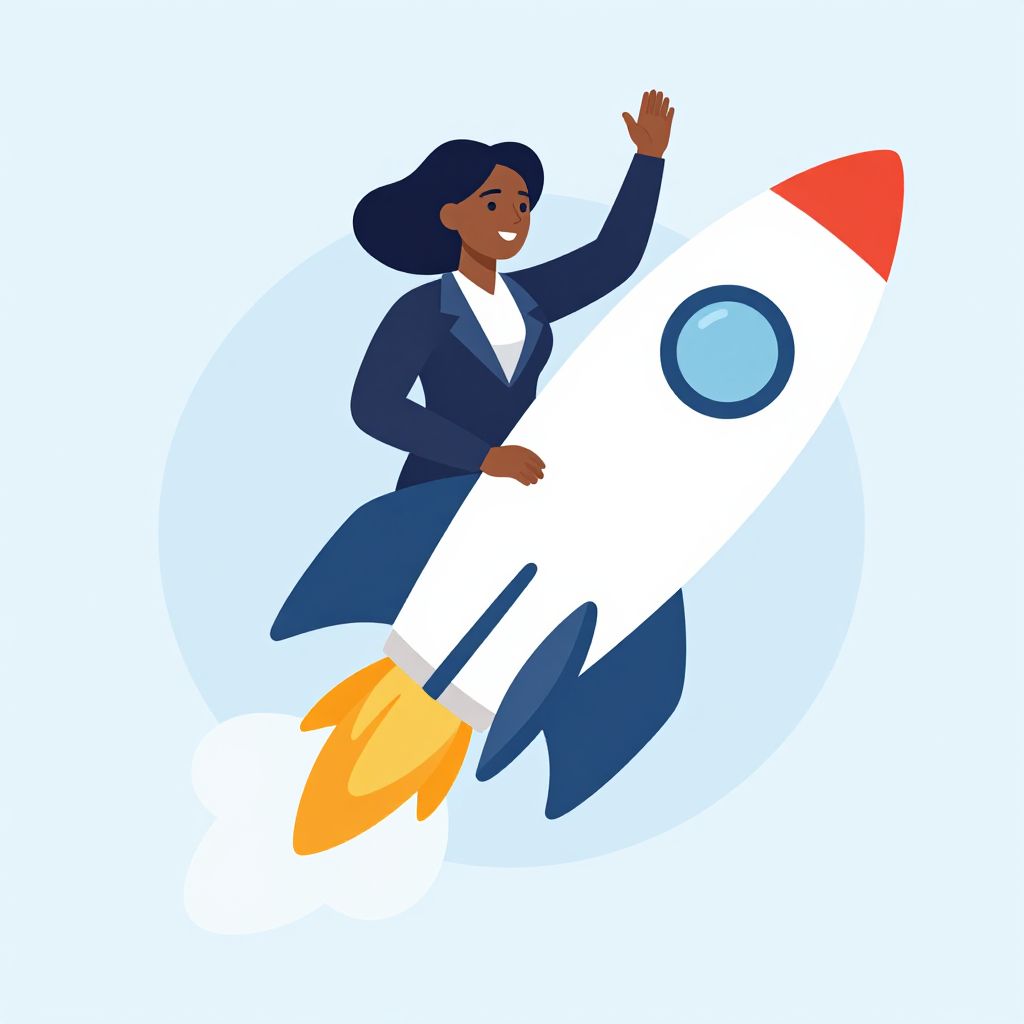 Digital illustration of a smiling Black woman in a navy suit and white shirt, riding a red and white rocket against a turquoise background. She waves one hand