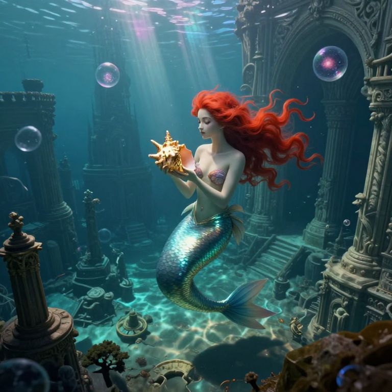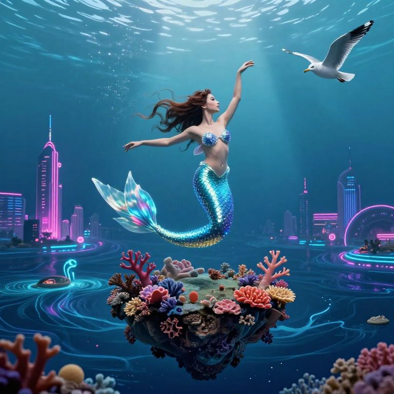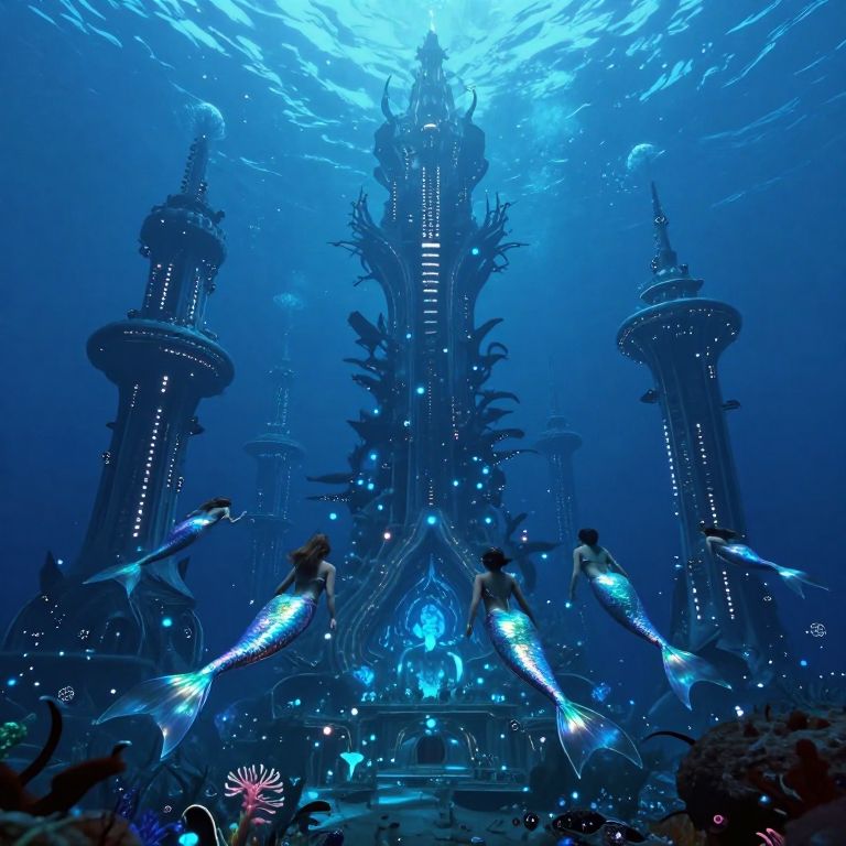 An imaginative digital art piece depicting a surreal underwater cityscape where giant sea creatures coexist harmoniously with futuristic architecture. A mermaid navigates through this alien world with ease, her biomechanical design reminiscent of the style that blends organic and industrial elements. The scene is captured from an unusual perspective, high above the ocean floor, offering a wide-angle view that emphasizes the vastness and complexity of this unique ecosystem. As the camera glides smoothly across this captivating underwater cityscape, it transitions seamlessly from the deep blue hues of the sea to the glowing neon lights of the advanced structures, creating an emotional gradient that conveys both tranquility and mystery.