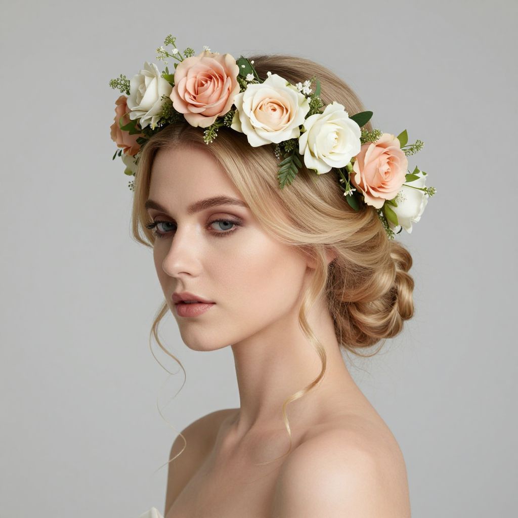 Elegant blonde woman wearing a dreamy half-pastel floral crown adorned with blush and ivory roses, complemented by green foliage, styled in a soft updo with loose tendrils cascading down her shoulders against a minimalist backdrop.
