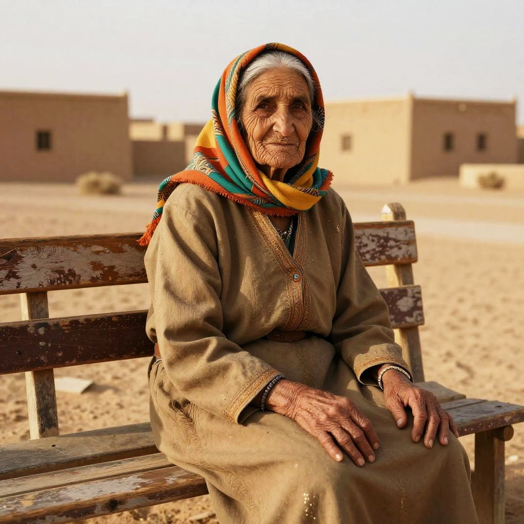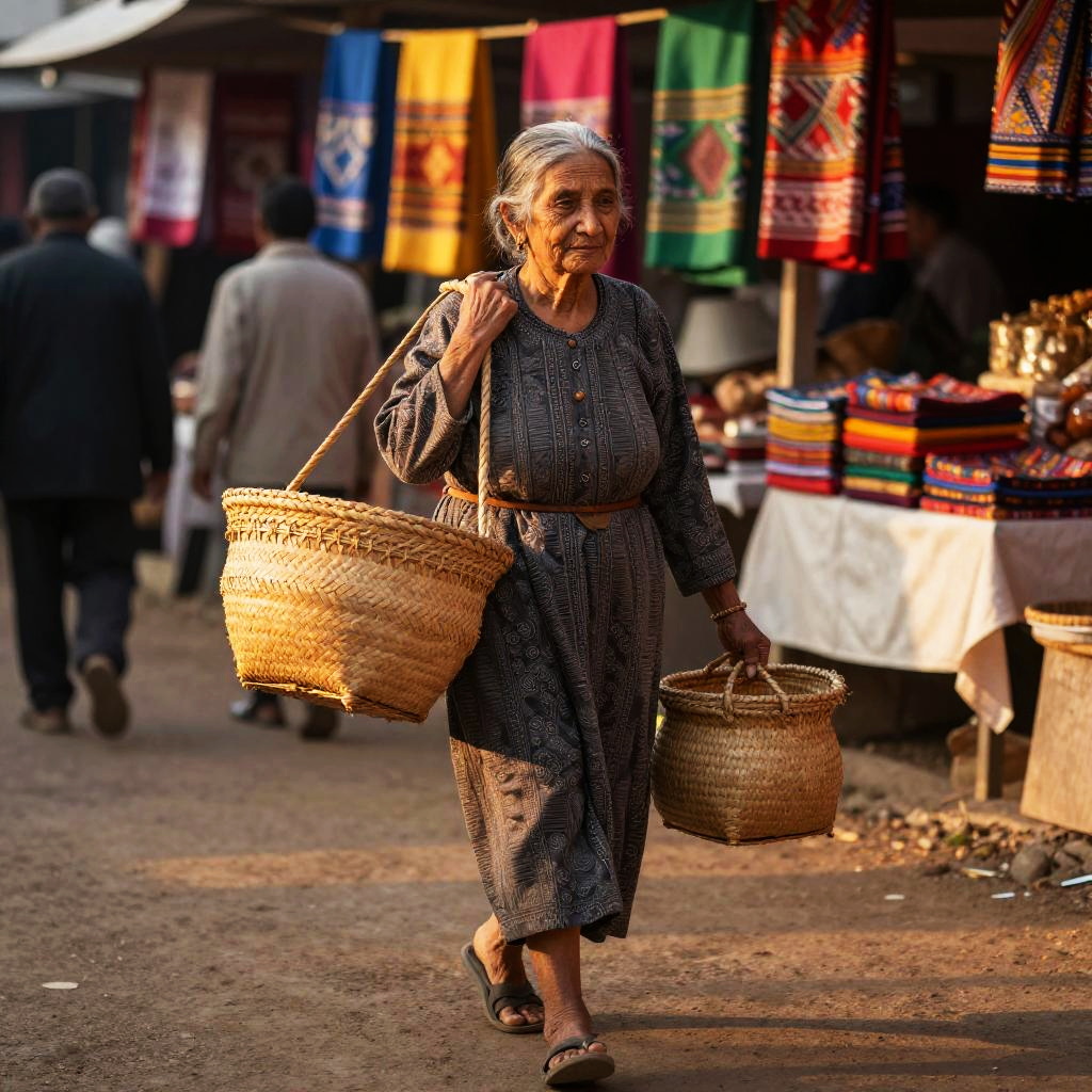 Old tan lady walking through a bustling marketplace at sunset, carrying woven baskets, vibrant traditional fabrics in the background, rich earthy tones, realistic style with soft shadows highlighting her serene expression and graceful posture.