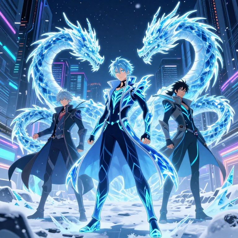 This digital anime-style illustration features three male characters with icy blue energy in a futuristic cityscape at night. The central figure, with short white hair, stands confidently, glowing with blue energy, flanked by two other men with black hair and coats. Two large, ethereal dragon-like creatures with glowing blue scales and ice-like textures hover behind them. Neon lights from towering skyscrapers illuminate the background in shades of purple, pink, and blue. The characters wear dark, long coats with blue glowing accents, standing on a glowing, icy ground. The overall atmosphere is dynamic and powerful, with a strong emphasis on the magical elements and futuristic setting.