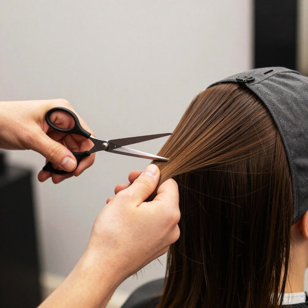 A close-up photo of a hairdresser cutting a person's brown hair. The hairdresser's hands are focused on the hair with scissors in one hand and pulling the hair with the other. The person's head is tilted back, wearing a gray hair cap. The background is slightly blurred, showing a neutral-colored wall. The image has a high-contrast, almost vibrant style.