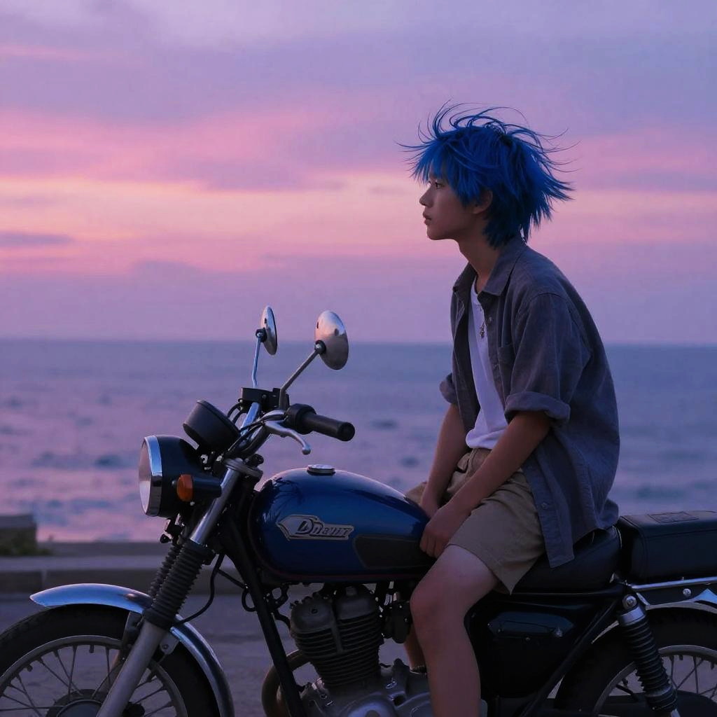 Blue hair boy sitting on a vintage motorcycle by the seaside at dusk, hair blowing in the breeze, vibrant sky with hues of pink and purple, realistic style with a painterly touch, contemplative mood, detailed textures on clothing and bike, calm and nostalgic atmosphere.