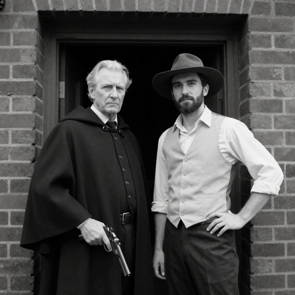 Black-and-white photograph of two men standing in front of a brick building. Older man with gray hair, dark cloak, holding a gun. Younger man with beard, wide-brimmed hat, light vest, shirt, standing in doorway. Younger man's hand on hip. Older man's intense expression. Wooden ceiling above. Doorway in background.