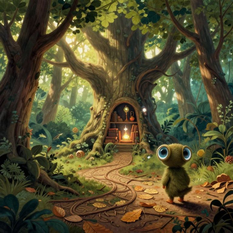 A vibrant, digital fantasy illustration depicts a whimsical forest scene with a large, enchanted tree at the center. The tree has a gnarled, twisting trunk and an arched doorway with a warm, glowing light emanating from within. A cobblestone path, strewn with autumn leaves, winds through lush green foliage towards the doorway. In the foreground, a small, cute, green, owl-like creature with large, round blue eyes stands on the path, gazing towards the door. Sunbeams filter through the dense canopy above, casting a magical glow over the scene. The background is filled with towering trees and various plants, enhancing the enchanted forest atmosphere.