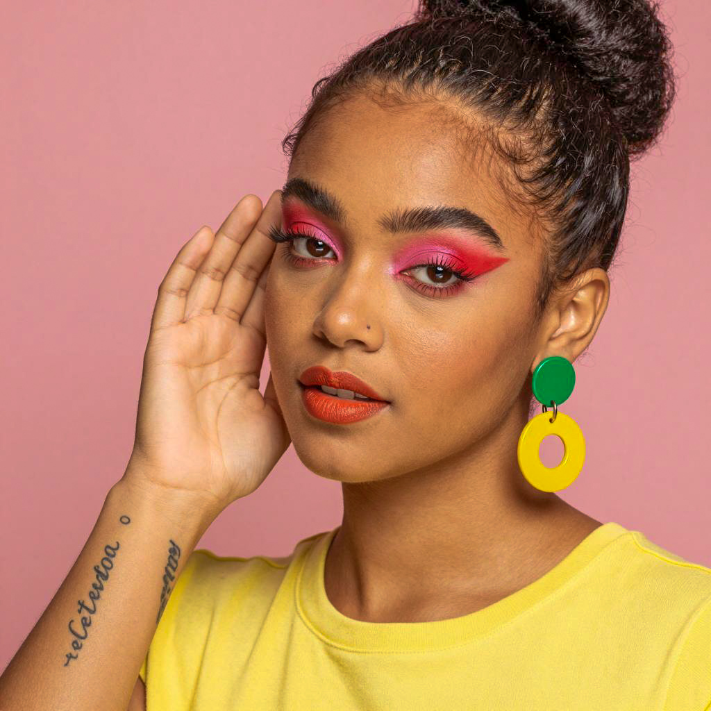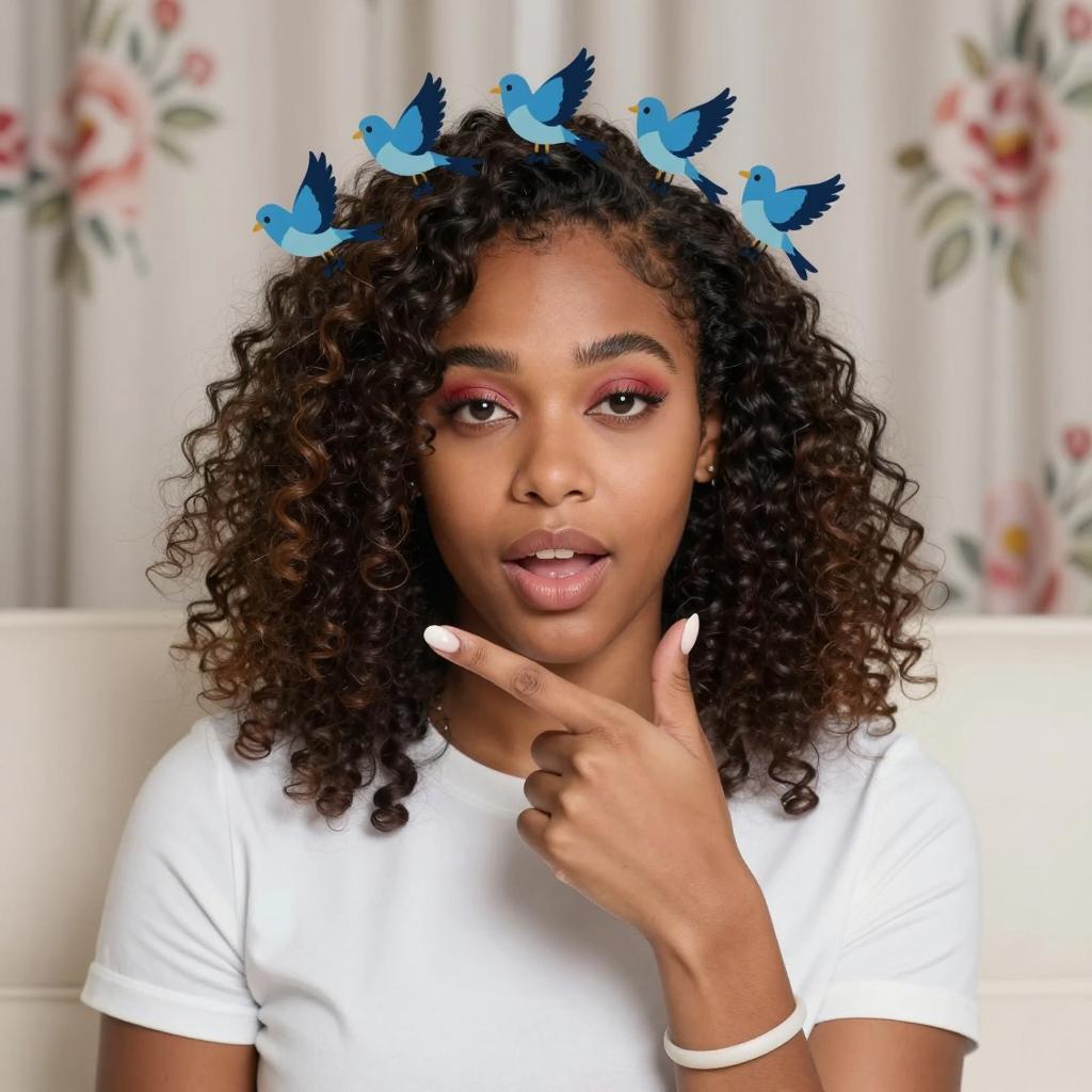 Black woman with curly hair, wearing a white top, has blue bird emojis on her head. She points at her white-manicured finger, lips slightly parted. Background: floral-patterned curtain, white couch. Her eyebrows are dark and thick, eyes have red eyeshadow. She wears a white bracelet on her right wrist.