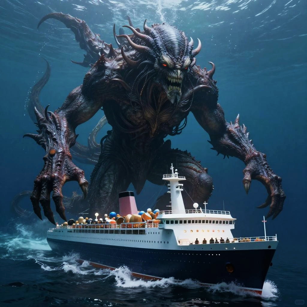 Digital artwork: Massive, monstrous sea creature with sharp claws and glowing eyes looms over a white cruise ship with orange lifeboats on dark blue ocean.