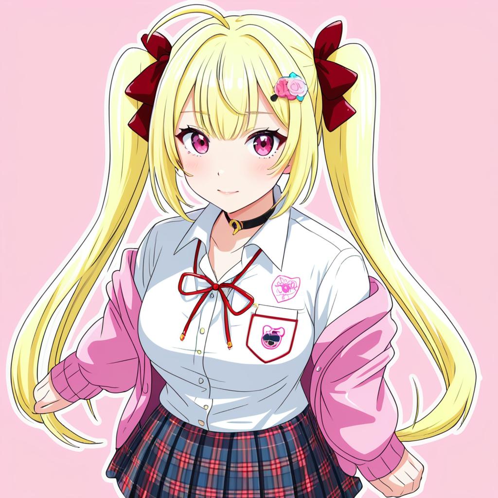 Hoshikawa sara (4th costume), nijisanji, 1girl, heterochromia, red eyes, yellow eyes, blonde hair, long hair, twintails, ahoge, hair ribbon, large breasts, school uniform, school uniform, white shirt, collared shirt, pleated skirt, plaid skirt, long sleeves, red bowtie, red ribbon, black choker, virtual youtuber, virtual youtuber, pink cardigan, by artist seijun, anime