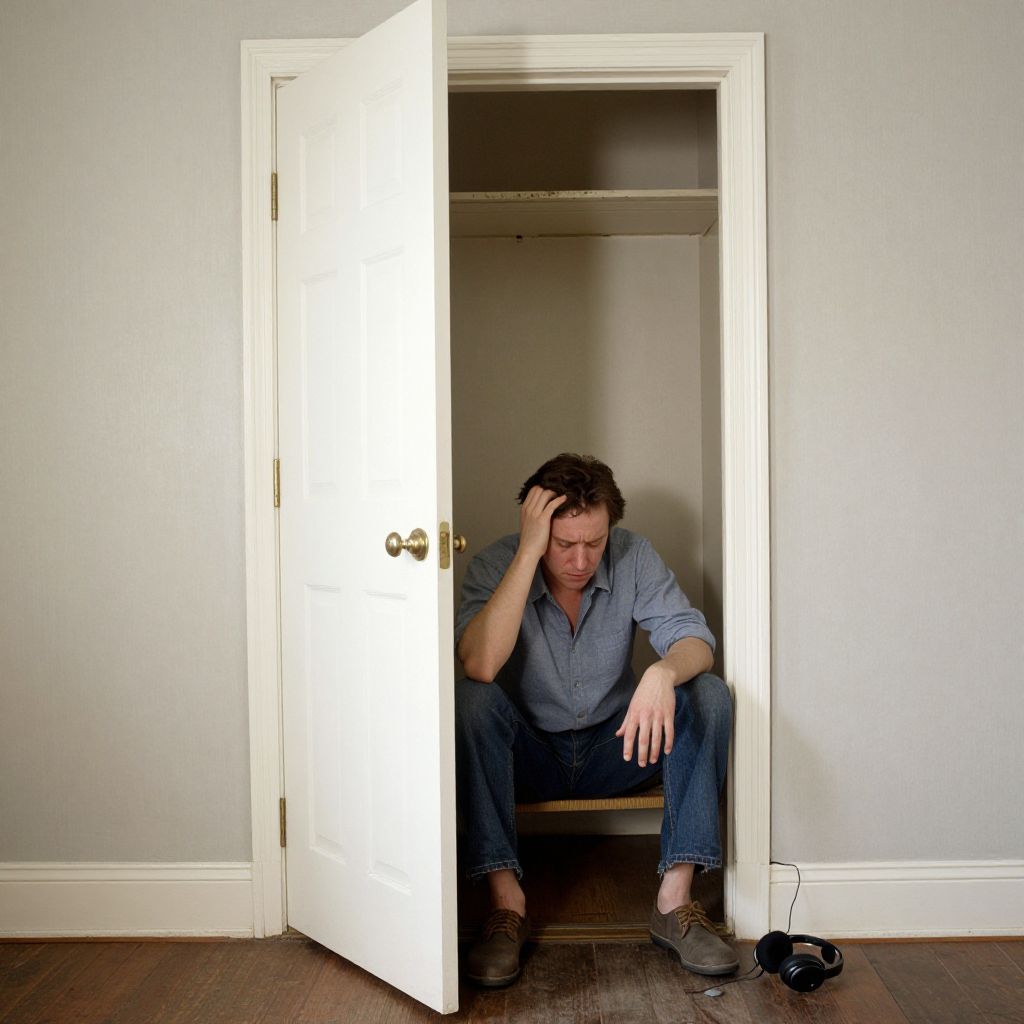 Photograph of a distressed man with dark hair, blue shirt, and jeans, sitting in a small, dimly lit closet, hand on head,