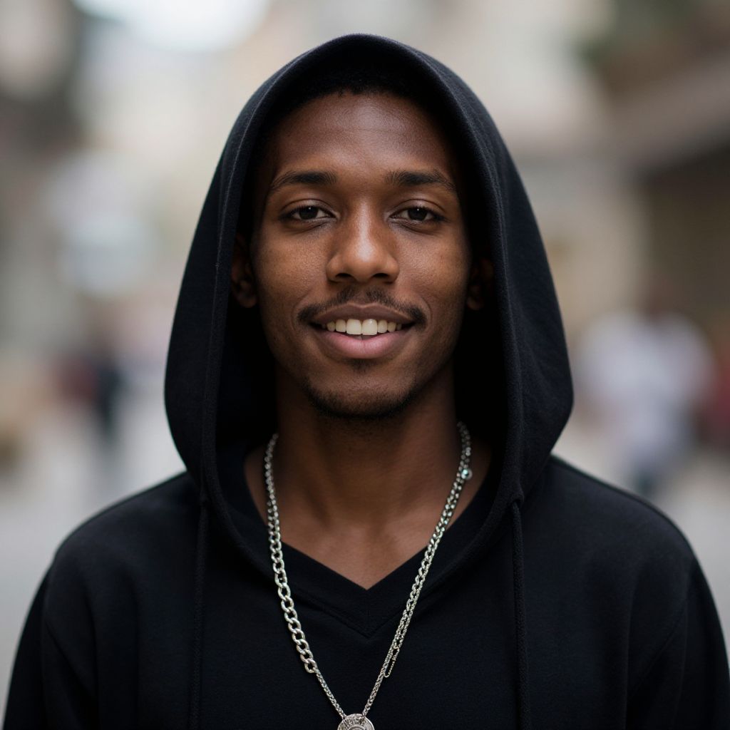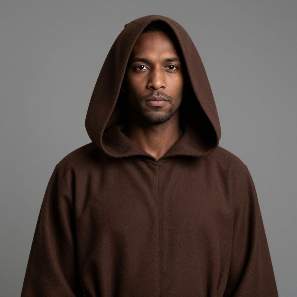 Photograph of a young Black man with a medium-dark skin tone, standing against a plain gray background. He has a clean-shaven face and a slight mustache. He is wearing a dark brown hooded sweatshirt with the hood up, casting shadows over his forehead and eyes. His expression is neutral, with a slight, calm gaze directed at the camera. The texture of the sweatshirt appears soft and slightly loose-fitting. The image is well-lit, highlighting the subtle textures of his skin and the fabric of his hoodie. The overall composition is simple and focused, with a professional studio-like quality.