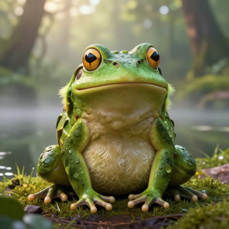 Frog dog hybrid creature sitting by a misty pond at dawn, blending amphibious green skin with fluffy canine features, intricate textures on the wet skin fur, realistic lighting, enchanting forest background, vibrant colors, fantasy art style