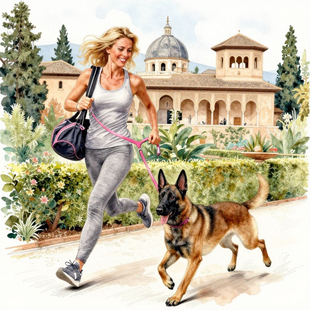 Gorgeous European woman, with blonde middle-length hair, sports clothes, holding the pink leash of her dog, doing sport, running in Granada's Alhambra palace gardens, smiling, happy, accompanied by a Laekenois Malinois dog with short fawn hair, black overlay, and mask face. Watercolor and ink patchwork style inspired by Albena Vatcheva, Ben W. Essenburg, Brenda Lyons, and Ivan Shishkin. Enchanting Generalife gardens backdrop, stunning landscape, elegant and sweet scene, cheeky look on the Laekenois. Draw a woman with blonde middle-length hair, carrying a sport bag and the pink leash of ther dog the Laekenois malinois dog short hair black face. Her dog, The Belgian Malinois. The Laekenois with short-haired has a black mask face Watercolor and ink patchwork in the style of Albena Vatcheva, and Ivan Shiskin: Both are in running dynamic moving motion among the enchanting gardens of Generalife Granada's Alhambra. A Stunning landscape from another time. A very sweet and cute scene. Very Elegant Modifiers:highly detailed sharp focus elegant extremely detailed fantasy studio lighting intricate portrait photorealistic very attractive beautiful dynamic lighting imperial colors fantastic view hyperrealistic 4K 3D crisp quality colourful hdr very cute High Octane Render impeccable sublime styling & design & scenery v 5.2