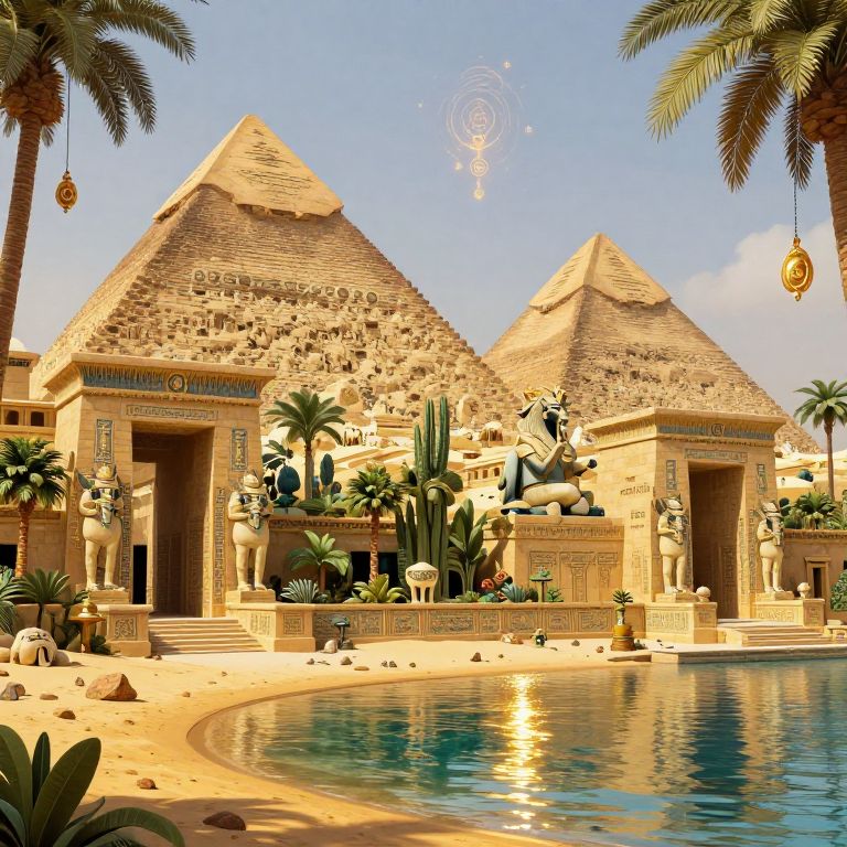 Digital illustration of an ancient Egyptian temple with two pyramids, palm trees, statues, and a reflective pool under a blue sky.