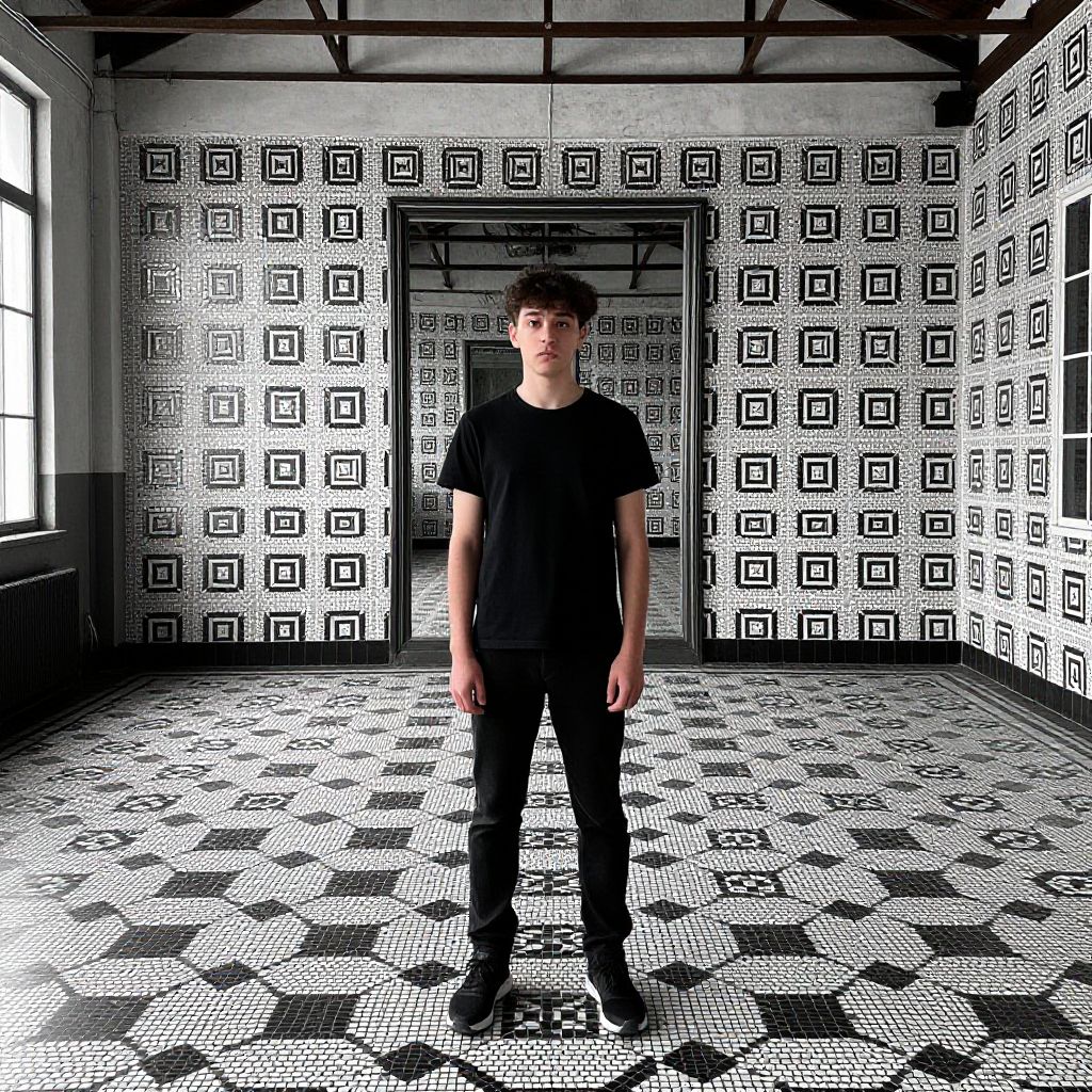 A high-contrast photograph inside a vintage industrial warehouse where the entire environment is composed of a single, repeating black-and-white geometric pattern—like a tessellated floor tile—with a young man with sharp cheekbones and tired eyes standing in the center, staring at a mirror that reflects only the motif.