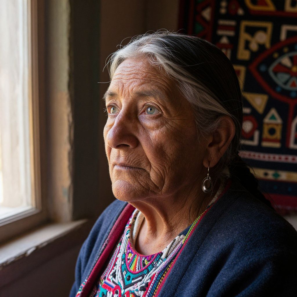Photograph of an elderly Indigenous woman with wrinkled skin, gray hair, and colorful traditional blouse, gazing out a window. Warm natural light highlights