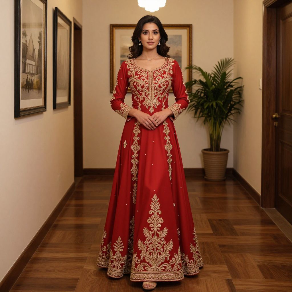 Elegant woman wearing a vibrant red gown adorned with intricate gold embroidery stands gracefully in a warmly lit hallway, surrounded by wooden flooring, framed artwork on the walls, and a potted plant to her right.