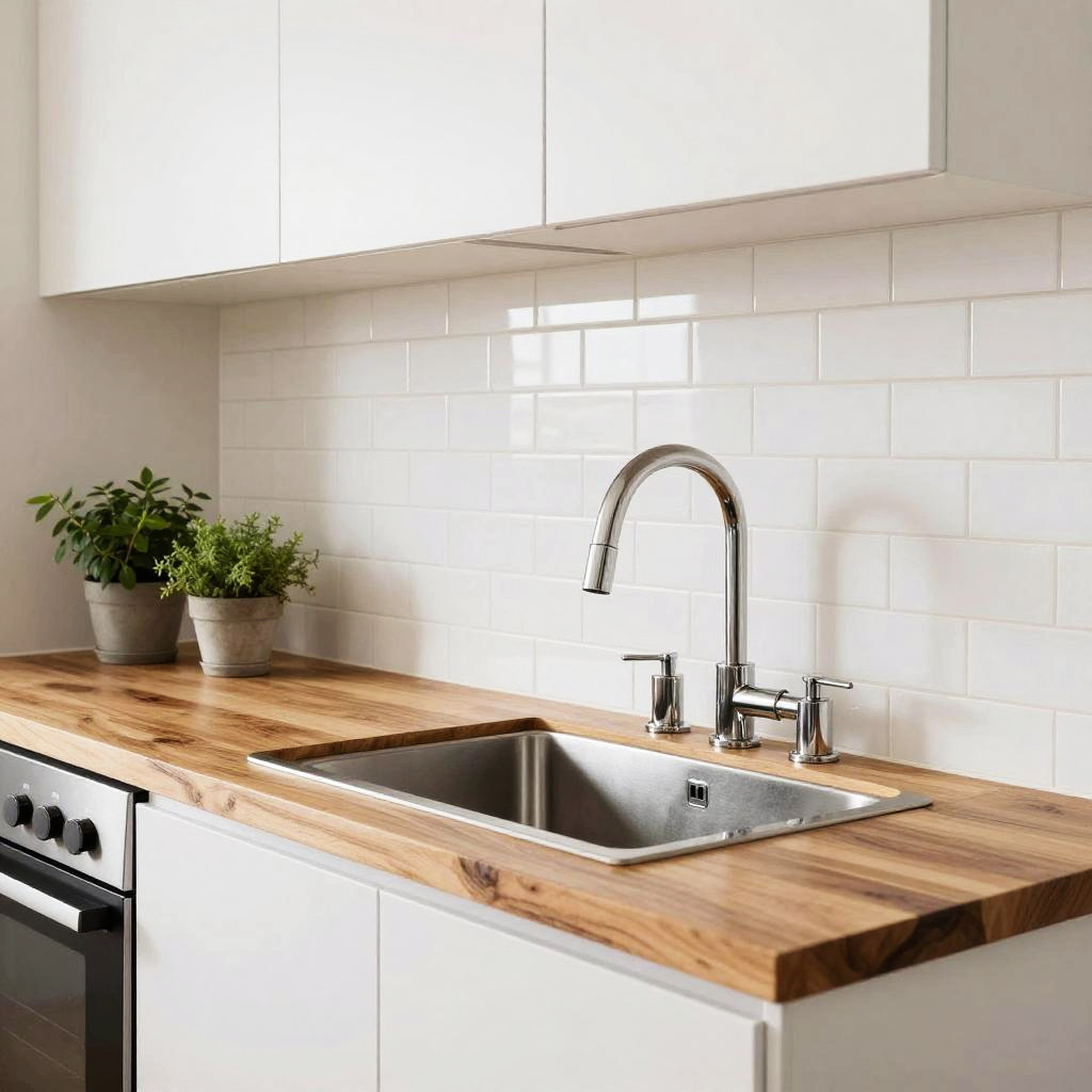 Bright contemporary kitchen with a rich butcher block countertop and crisp subway tile backsplash, polished chrome fixtures, potted herbs on the counter, and clean, minimalist styling