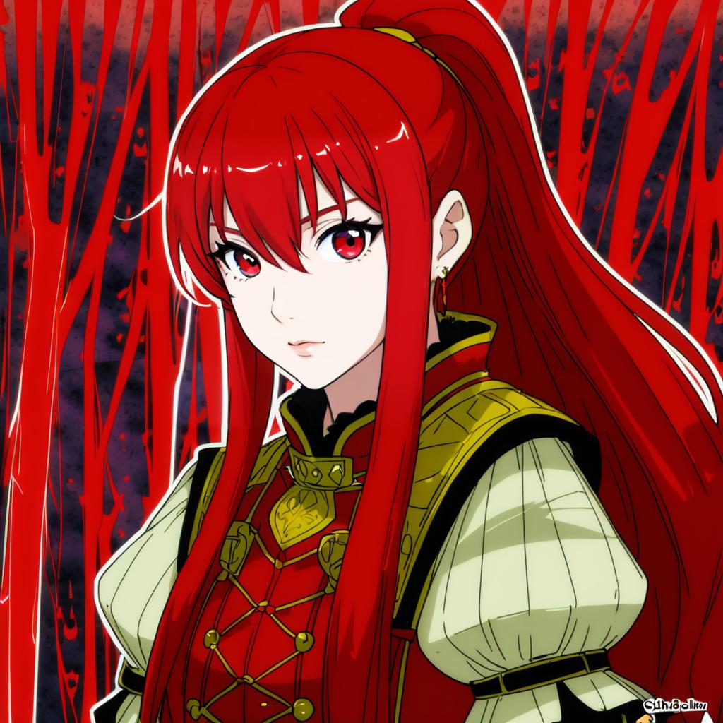 Anna (fire emblem), fire emblem, 1girl, red eyes, hair between eyes, red hair, long hair, ponytail, sidelocks, medium breasts, by artist chikuwa., anime