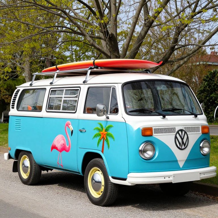 Vividly painted Volkswagen bus parked on a gravel path, featuring colorful decals of a flamingo, a starfish, and a palm tree, with a red surfboard securely strapped to its roof rack amidst a backdrop of leafy trees and spring foliage.