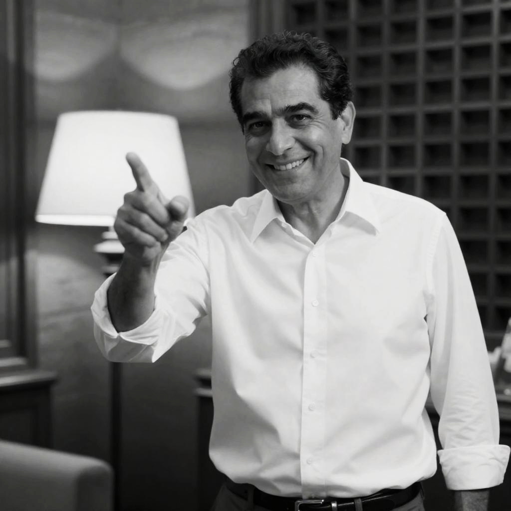 Photograph of a middle-aged man with dark hair and a thick mustache, wearing a gray suit, blue shirt, and patterned tie. He points forward with his right index finger, smiling intensely. Background includes a building with "Leasing" and "Mercedes" signs, and several parked cars. Sunlight casts shadows on the scene.