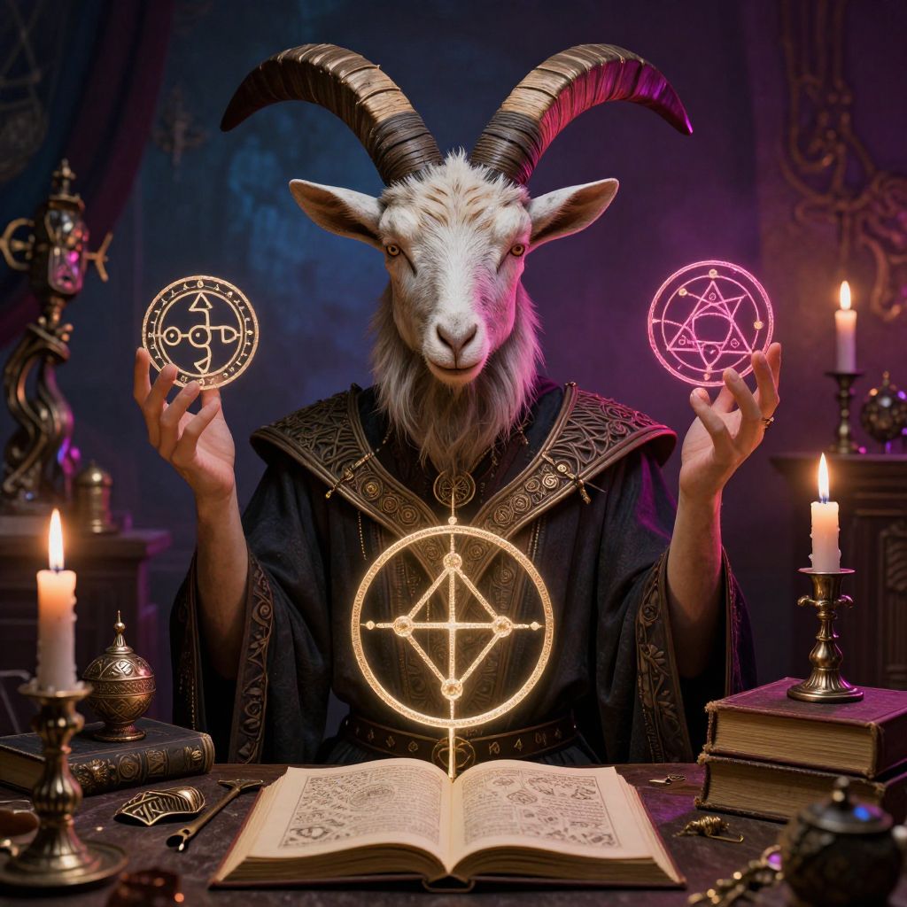A surreal depiction of Bafomet as a symbolic figure, blending human and goat features, surrounded by alchemical symbols and arcane books, set against a backdrop of a candlelit chamber filled with mystical artifacts, dramatic shadows and vibrant colors