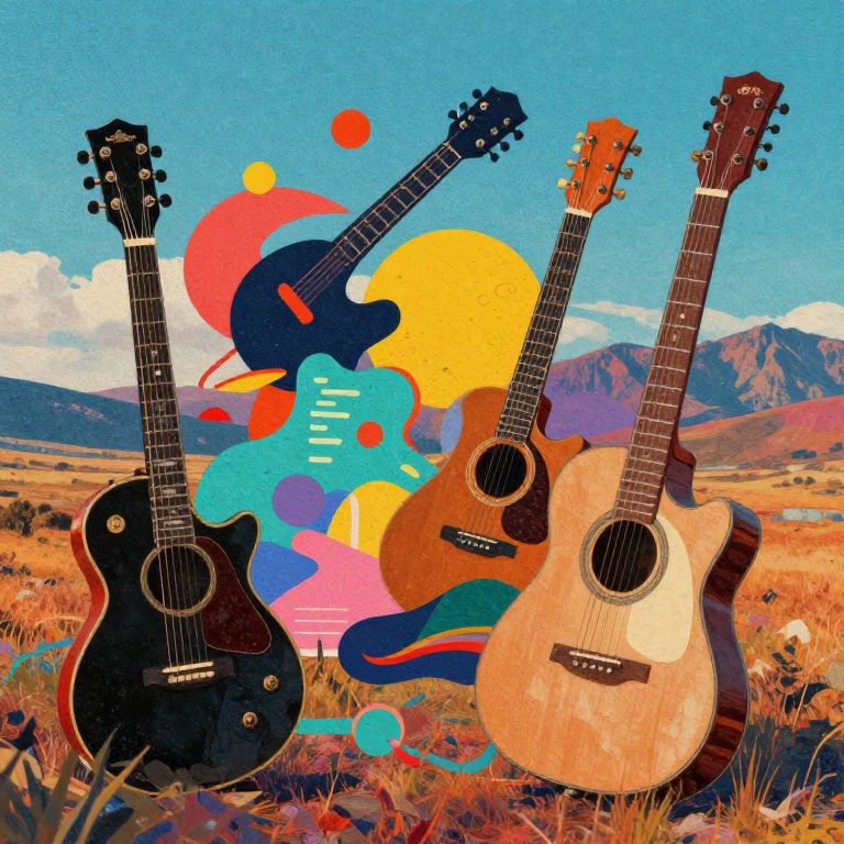 This vibrant digital artwork depicts three acoustic guitars standing upright in a dry, grassy field with a mountainous landscape in the background. The guitars, positioned from left to right, are black, brown, and tan. The background features a bright blue sky with a large, stylized yellow sun and colorful abstract shapes, including red, blue, and pink circles. The grass in the foreground is orange and yellow, adding warmth to the scene. The overall style is modern and abstract, with a high-contrast, saturated color palette and a textured, almost grainy digital finish.