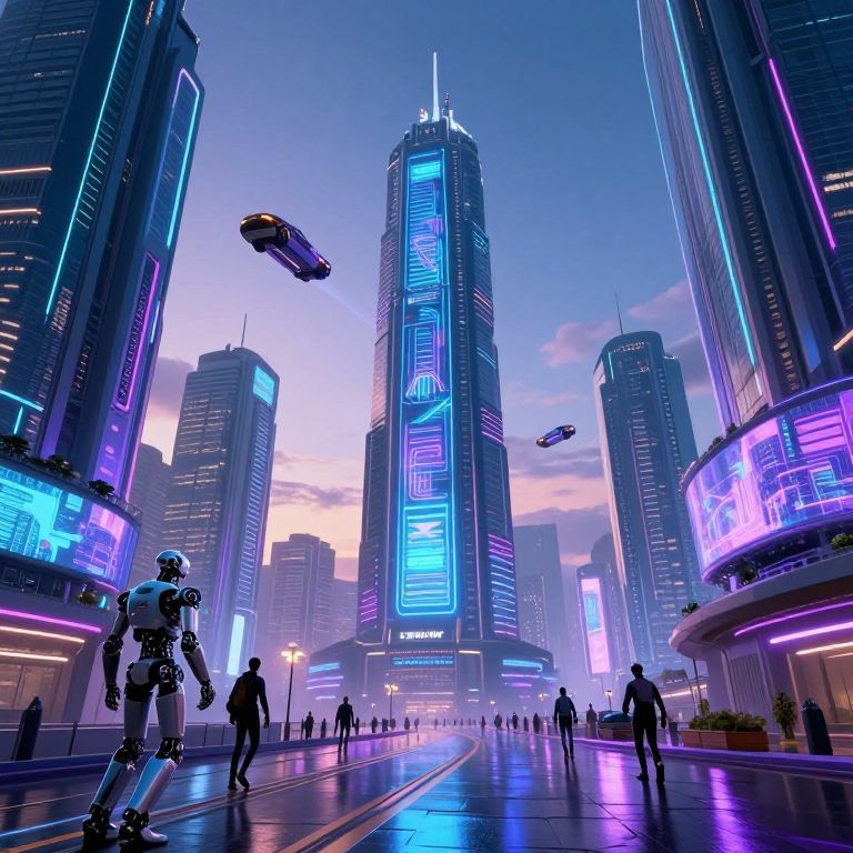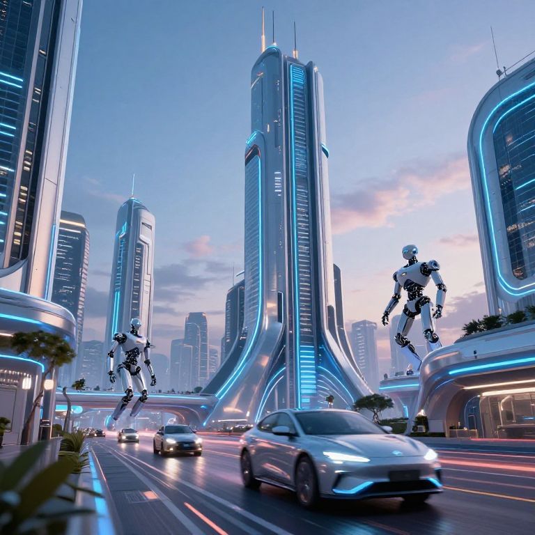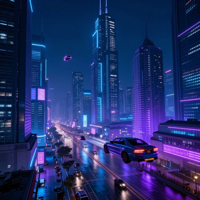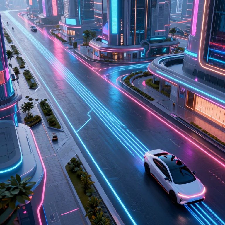 A futuristic cityscape with advanced paving technology, self-laying smart roads glowing with neon circuits, sleek modern vehicles on smooth surfaces, clean lines and reflective materials, vibrant cyberpunk colors, highly detailed concept art.