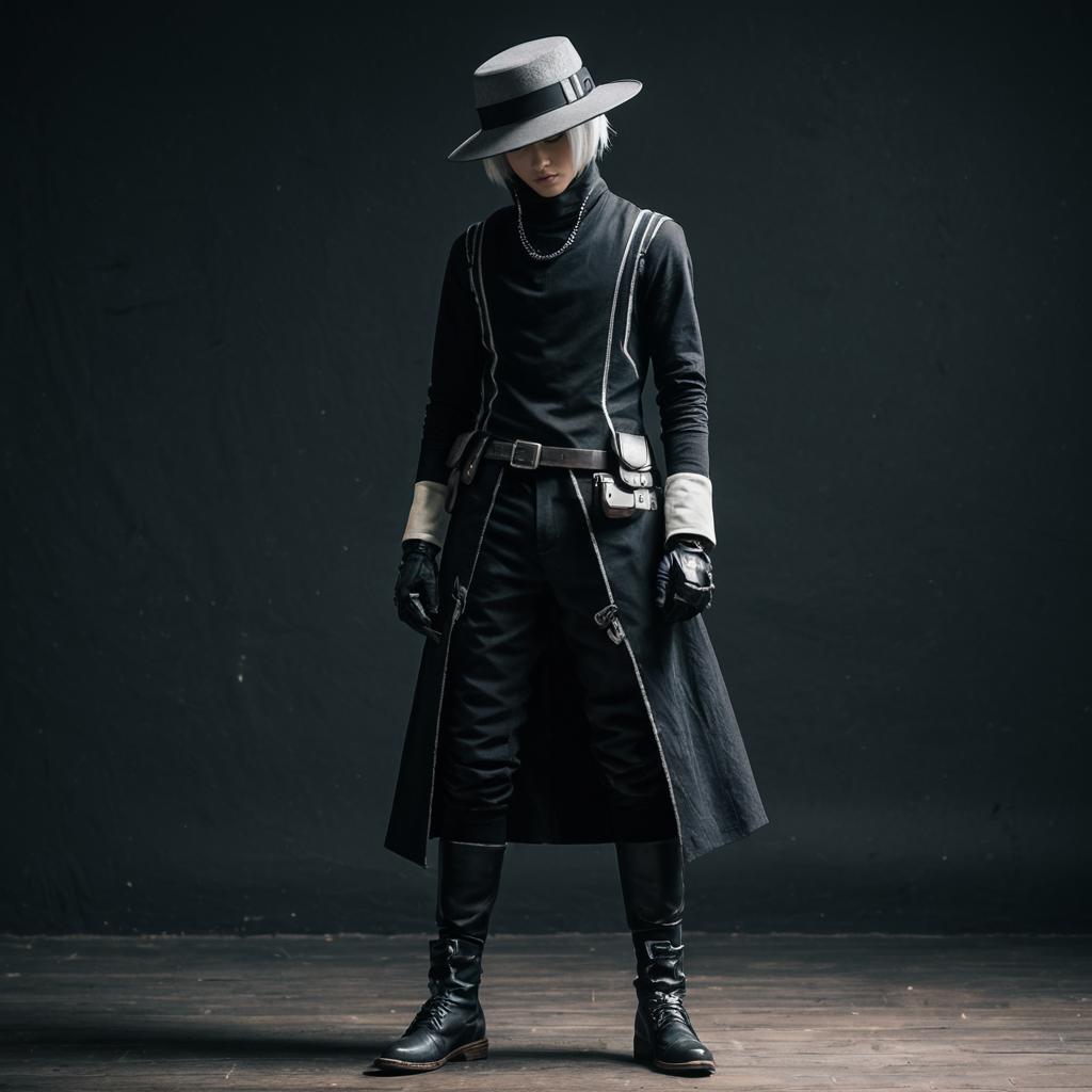 Full body portrait of a male wearing a Nier Automata inspired costume featuring a long black coat with white trim, black pants, black boots, leather gloves, and a wide-brimmed gray hat with black band. The subject has silver hair and stands confidently against a dark backdrop.