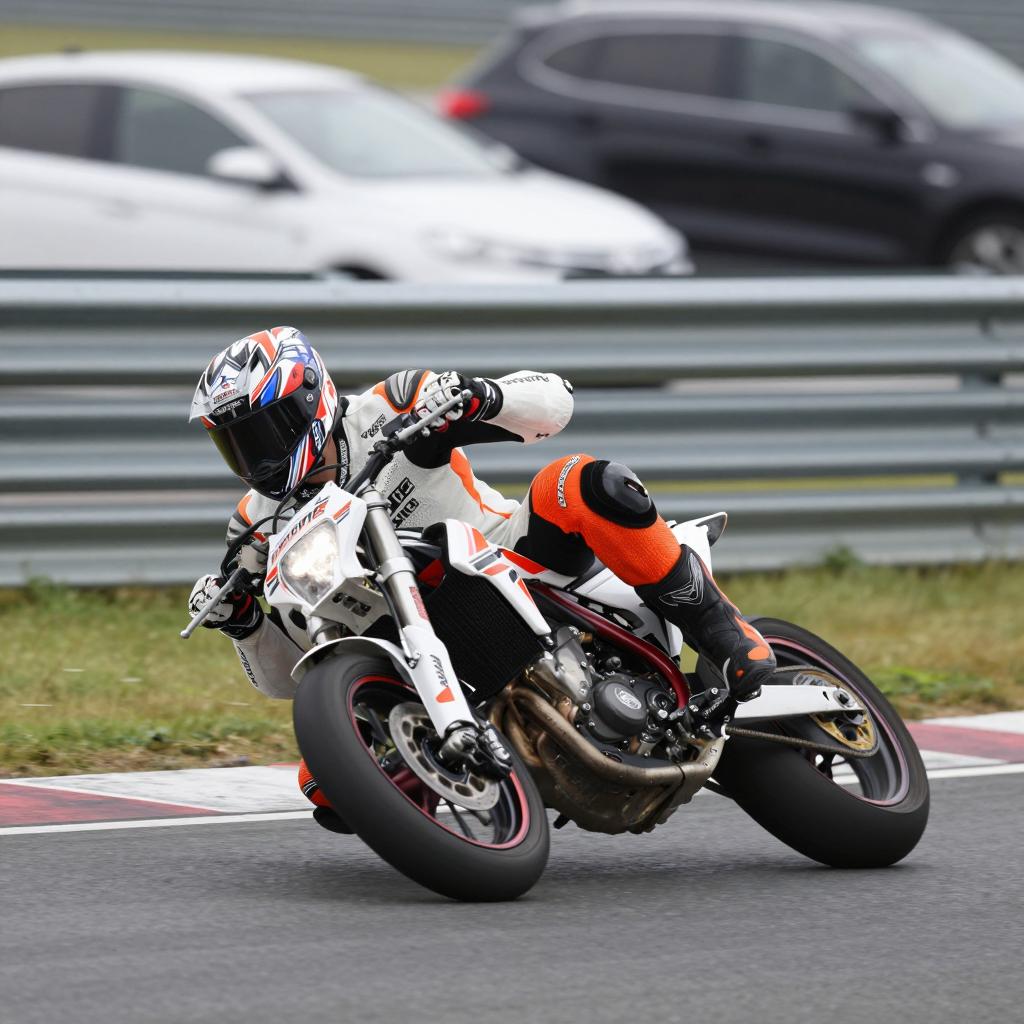 Motorcyclist in white and orange racing suit, black pants, and helmet, leaning into a sharp turn on a racetrack. Blurred background with cars and metal guardrail. Motorcycle tilted to the left, front wheel lowered. Mid-action shot.