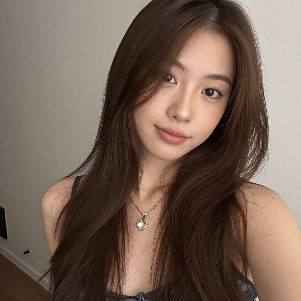 Photograph of an East Asian woman with fair skin and long, straight brown hair, wearing a large, fluffy, beige fur hooded coat. She has brown eyes, subtle makeup, and is looking directly at the camera with a neutral expression. Her small silver hoop earrings are visible. The fur hood is voluminous and textured, framing her face. The background is dark and blurred, highlighting her as the main subject. The lighting is soft, casting gentle shadows on her face. The overall style is realistic and natural.