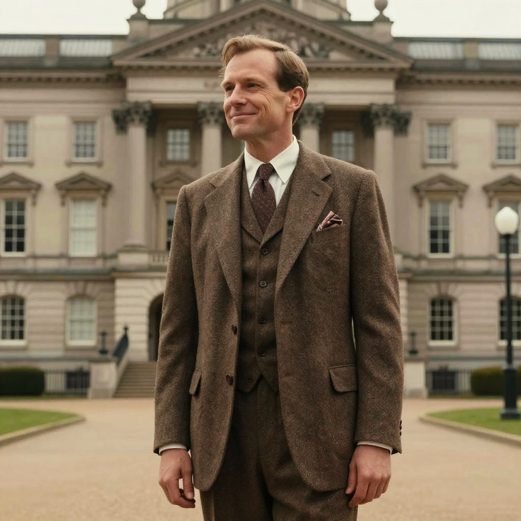 Politician suit, vintage style brown tweed jacket with pocket square, old government building in background, thoughtful pose and slight smile, cinematic lighting and depth