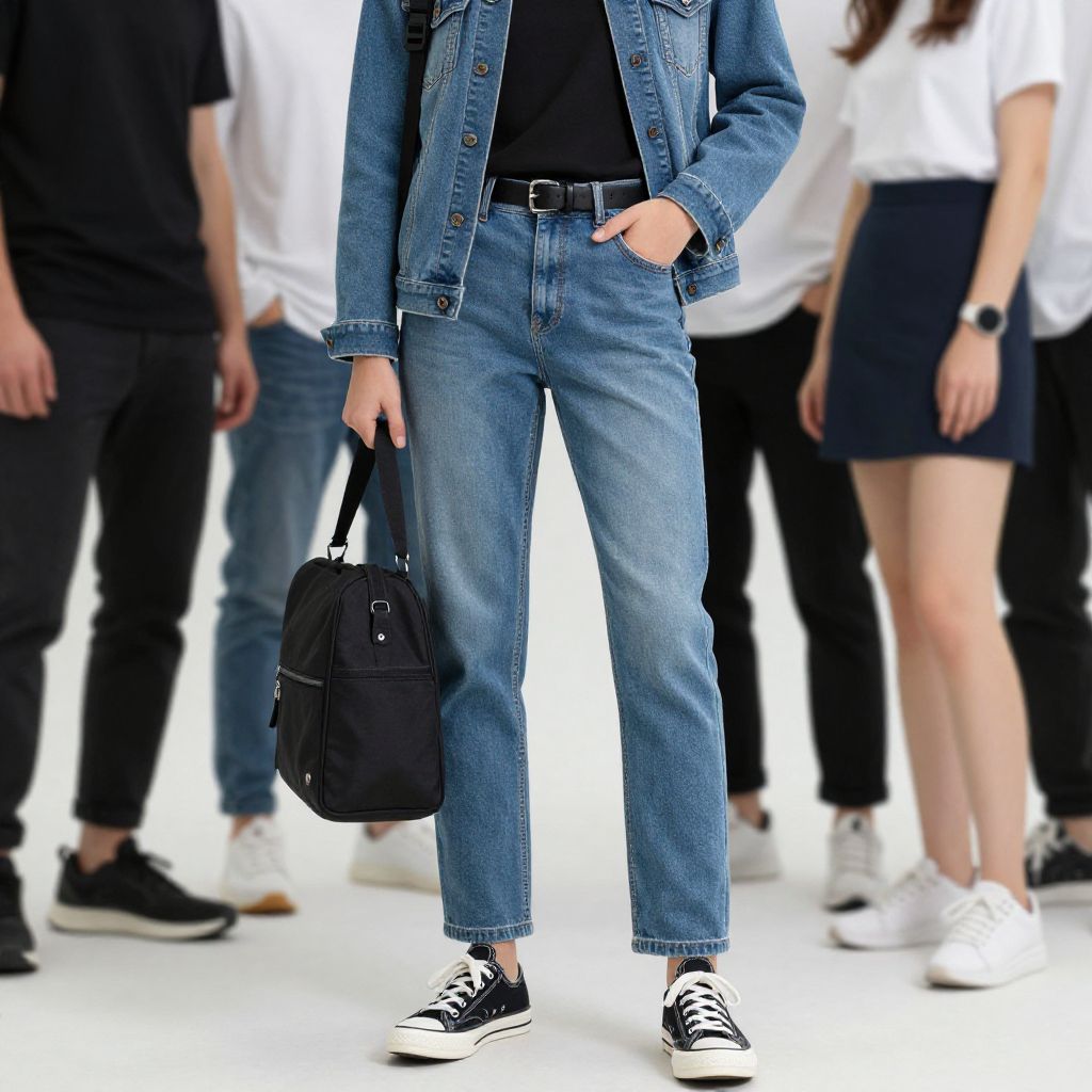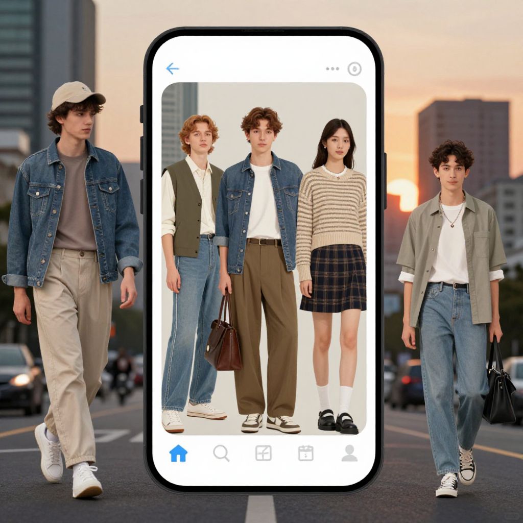 Photograph of a city street at sunset with blurred buildings in the background. Three young adults, two on the left and one on the right, walk in front of a large smartphone screen displaying a fashion model duo: a curly-haired man in a denim jacket, white shirt, and beige pants, and a woman with straight black hair in a striped sweater and plaid skirt. The smartphone screen also shows navigation icons. The real-life individuals mirror the screen's fashion, wearing similar outfits with denim jackets and casual pants. The woman on the right carries a black handbag.