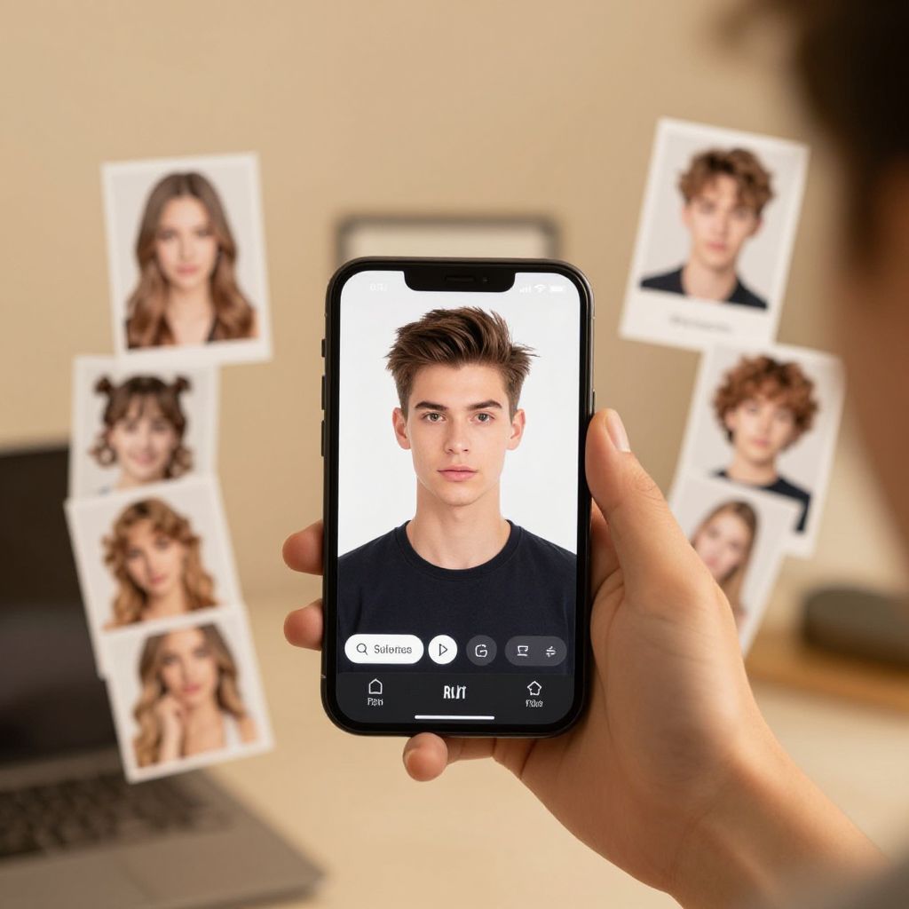 Photograph of three young men in casual denim outfits, flanking a smartphone screen showing a similar group in urban sunset background.