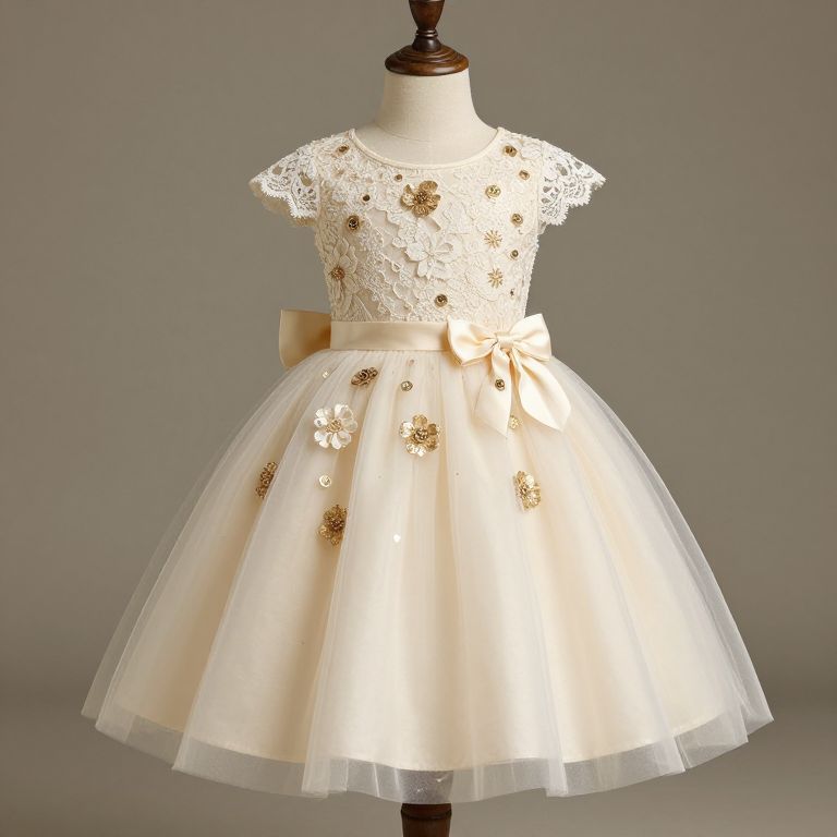 Photograph of an elegant, cream-colored children's dress displayed on a mannequin. The dress features a lace bodice with intricate floral patterns and short, delicate lace sleeves. The skirt is a full, A-line tulle overlay with a satin underskirt, adorned with small, gold floral appliqués. A large, cream satin bow is tied at the waist. The background is a plain, light gray, highlighting the dress's details. The mannequin has a dark wooden neck and stand. The overall style is classic and sophisticated, suitable for a formal event or wedding.